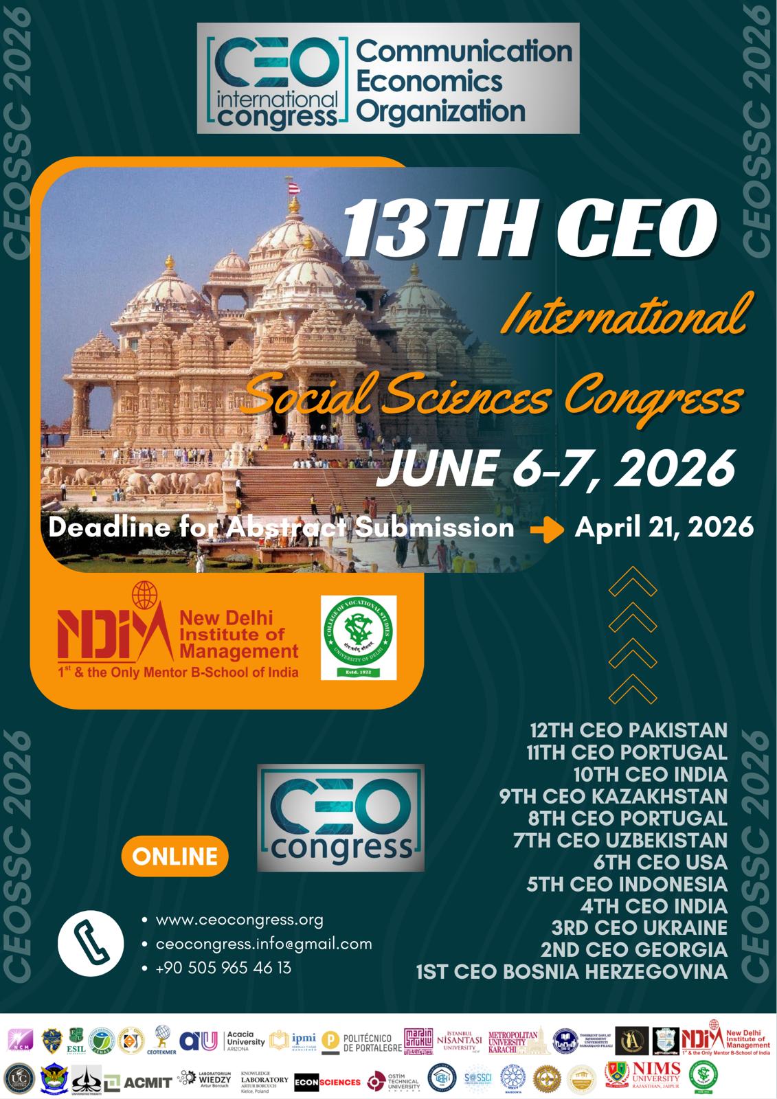 "13th International CEO and Social Sciences Congress (CEOSSC)" will be organized on 6-7 June 2026 in collaboration with New Delhi Institute of Management (Host University for 13th CEO Congress), College of Vocational Studies University of Delhi, Metropolitan University Karachi, Polytechnic Institute of Portalegre, Ghazi University, Esil University, Mardin Artuklu University, Acacia University, IPMI International Business School, Mohanlal Sukhadia University, Samarkand Branch of Tashkent University of Economics, International Vision University, Alfred Nobel University, Nişantaşı University, University of Prizren, Cyprus West University, Ciputra University, Universitas Dirgantara Marsekal Suryadarma, EconSciences, ACMIT, NCM Publishing, Insec, CEO Tekmer, Ostim Technical University and Trisakti University.